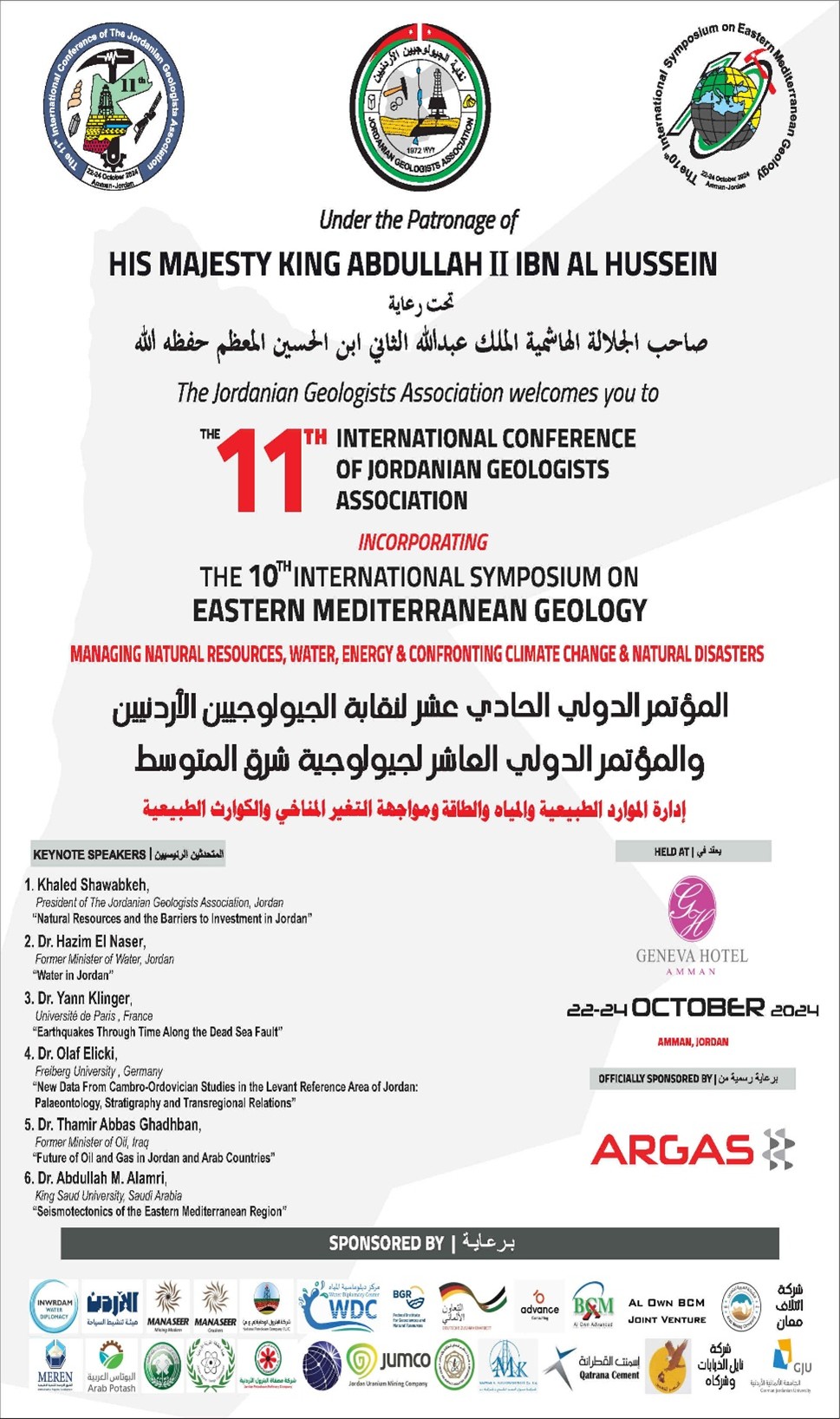 برعاية ملكية سامية، انعقد المؤتمر الدولي الحادي عشر لنقابة الجيولوجيين الأردنيين والمؤتمر الدولي العاشر لجيولوجية الشرق المتوسط خلال الفترة 22–24 تشرين الأول 2024 ، تحت شعار: